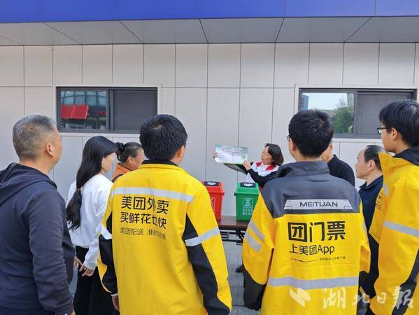游戏之余,社区洁净家园志愿服务队为参加活动的骑手与居民讲解垃圾分类知识,倡导共创美丽家园。