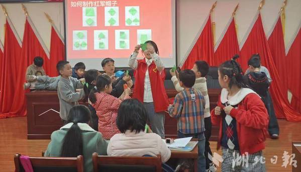 活动伊始,志愿者邓锦玉以“爱国是什么”为核心问题开启互动,孩子们结合升旗、唱国歌等生活场景踊跃发言,现场氛围热烈。随后进入“认识祖国领土,保卫领土完整”环节,志愿者借助中国地图与PPT,用通俗语言讲解了国家领土、行政区划等知识,清晰梳理了香港与澳门的回归历程,阐明了台湾与祖国大陆的历史渊源,着重强调了一个中国原则与领土完整的重要性。此后,孩子们通过“帮省份回‘家’”拼图游戏协作认识中国版图,聆听志愿者以动画和绘本讲述的抗日小英雄王二小的故事,并动手用红色卡纸、五角星贴纸等材料制作红军帽。戴上亲手制作的帽子后,大家化身“小红军”进行角色扮演,沉浸式体验中,学生鲁佳音说:“通过这次活动我感受到了英雄们勇敢无私的精神,我也将努力学习,未来成为祖国的骄傲。”