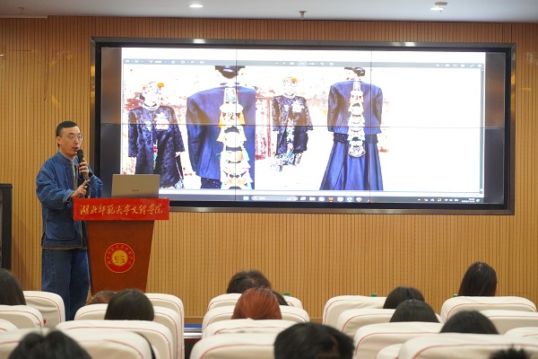 讲座中,冯三三先生以《非遗正当年》为题,围绕非遗服饰工艺转化与产品落地全流程,结合自身“阳新布贴”系列设计、《阳新物语》非遗时装发布等案例,系统拆解非遗文创品牌筹备、运营技巧和IP孵化等关键问题。讲座为学子搭建了“文化传承+商业创新”的思维桥梁,让大家学会将传统工艺与当代审美、商业需求结合思考。同学们纷纷表示,通过本次学习,改变了对非遗“古老、小众”的认知,深刻意识到非遗不仅是需保护的文化遗产,更是可转化的创业资源。