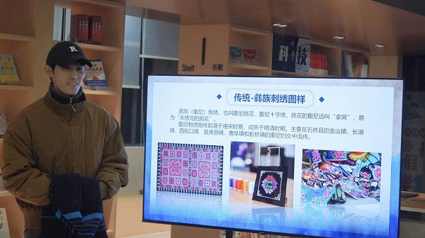 地惹瓦尔同学做“从凉山彝族文创看传统到现代的文化蝶变”主题分享。他现场展示带有羊角纹、蕨菜纹等传统元素的彝族手绣服装,并结合所学专业知识,解析彝族文化通过流行音乐、电影等载体走向大众的经济文化逻辑,分享索玛花图腾文创周边、彝族高定饰品品牌等案例,展现了民族文化交融赋能产业发展的鲜活实践,传递出铸牢中华民族共同体意识的时代内涵。