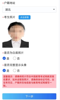 5.选择出生日期和户籍,然后“点击获取”检查考生照片。(请务必确保出生日期和户籍选择和中国教育考试网填写一致,请仔细核对保存一致)