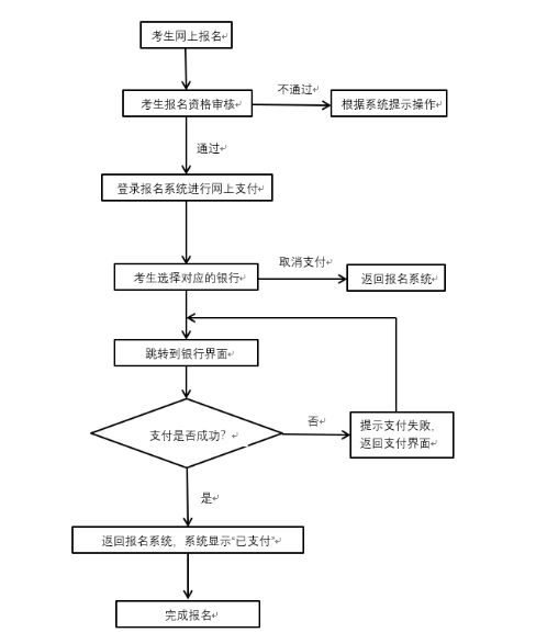 登录→注册→网上报名→扫码上传资料→ 等待审核→ 审核通过→网上缴费。