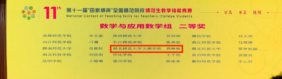 近日,第十一届“田家炳杯”全国师范院校师范生教学技能竞赛决赛结果公布。我院学生龚琳雅(指导教师:郑绿洲)凭借扎实的专业基础、出色的教学设计以及稳定的现场表现,在激烈竞争中脱颖而出,荣获全国高中数学组二等奖。