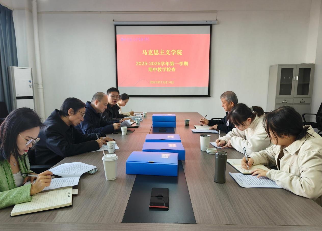 20251114日,马克思主义学3号实验楼208会议室召开了本学期期中教学检查座谈会。校党委书记许光、教务部副部长蒋严谨教学督导王元汉等领导和老师莅临指导,学院院长周青山和部分老师参加会议。
