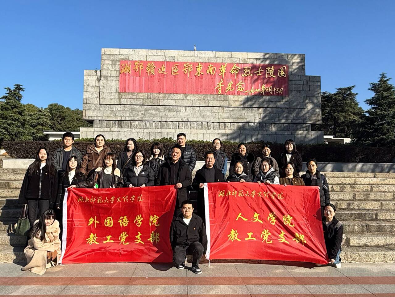 为巩固拓展学习贯彻习近平新时代中国特色社会主义思想主题教育成果,进一步提升党员党性修养,增强基层党组织的凝聚力与战斗力,2025年11月19日,人文学院党总支书记周景斌与外国语学院党总支书记赵卫军联合组织两院教工党支部全体党员,赴阳新县湘鄂赣边区鄂东南革命烈士陵园及学校扶贫驻地木港镇子山村,开展了一场深刻的主题教育实践活动。
