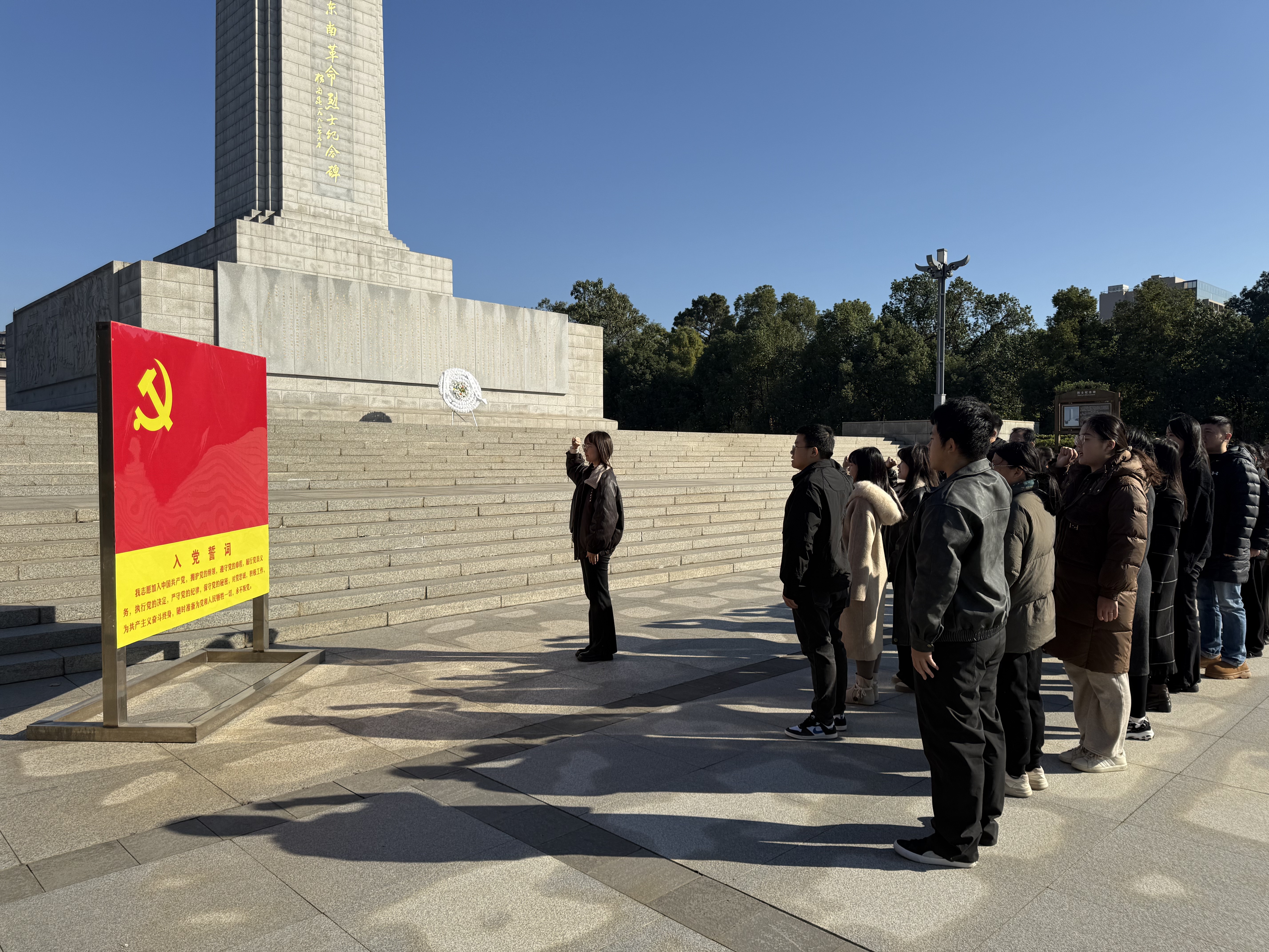 上午8:30,全体党员从江南·体育图书馆门前统一乘车出发,于9:30抵达湘鄂赣边区鄂东南革命烈士陵园。在巍然屹立的革命烈士纪念碑前,党员同志们整齐列队,于纪念碑前肃立默哀,表达对革命先烈的深切缅怀与崇高敬意。随后,党员代表向烈士纪念碑敬献花篮,学院领导上前整理挽联,寄托哀思。面对鲜红的党旗,全体党员重温入党誓词,铿锵誓言响彻陵园,坚定初心使命。