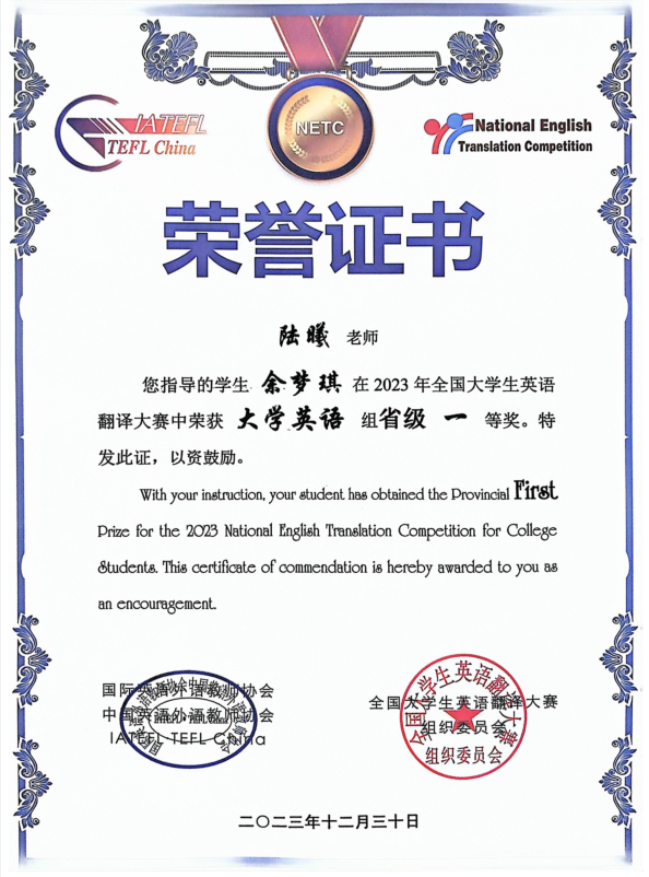 2023年全国大学生英语翻译大赛顺利完赛。来自清华大学、北京大学、武汉大学、浙江大学、复旦大学、厦门大学、中国人民大学等2161所高校,近6万名学子参加了竞赛。江南online(中国)理工学部网络工程2301班余梦琪同学荣获省级一等奖!辅导员陆曦老师获指导老师奖。