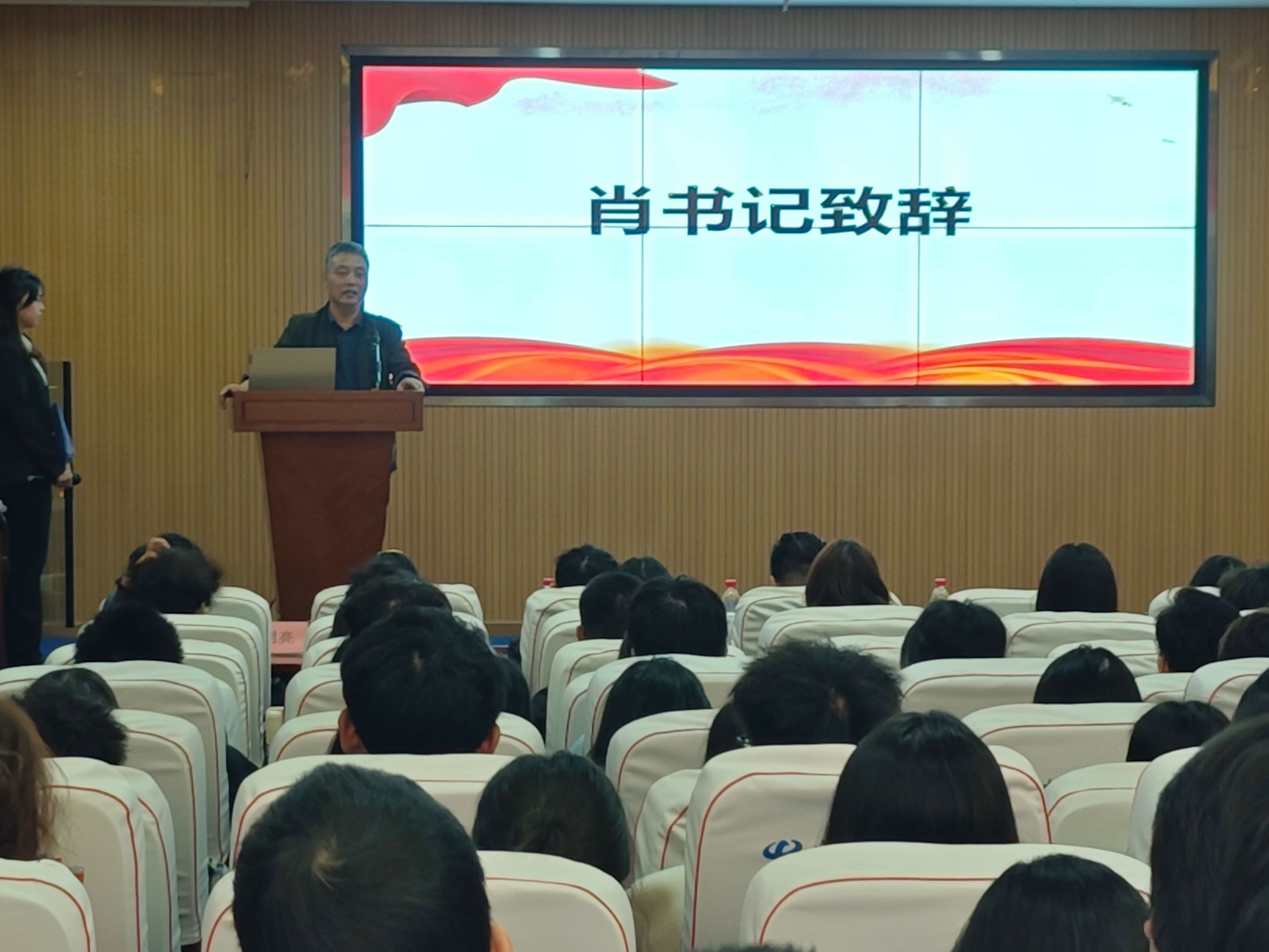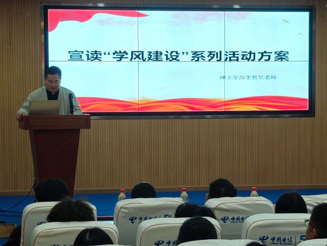 首先,肖圣芳书记发表了致辞。肖书记向同学们阐述了加强学风建设以及增强安全防范意识的意义并对班委们提出了殷切期望。他希望各班班委能够加强学习,加强团结,提高思想认识与政治站位,做好领头羊、做好老师与学生的纽带、做好老师的小助手;接着,李哲昊老师介绍了“学风建设月”系列活动方案。李老师向大家介绍了学部策划的8项活动,这些活动形式丰富多样、具有很强的针对性,并且尤为注重因材施教这一理念,照顾到了不同专业、不同年级学生对活动的需求;随后,理工学部学习部部长沈雪茹同学进行了倡议发言。她倡议全体理工学子要立志高远勇担使命、树立良好的学风和班风,以青春风采和实际行动推进学风建设。