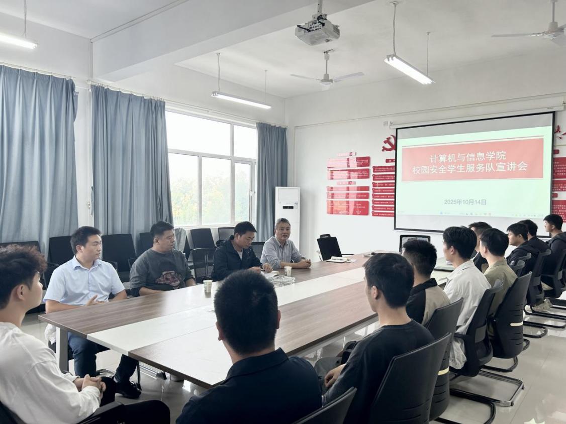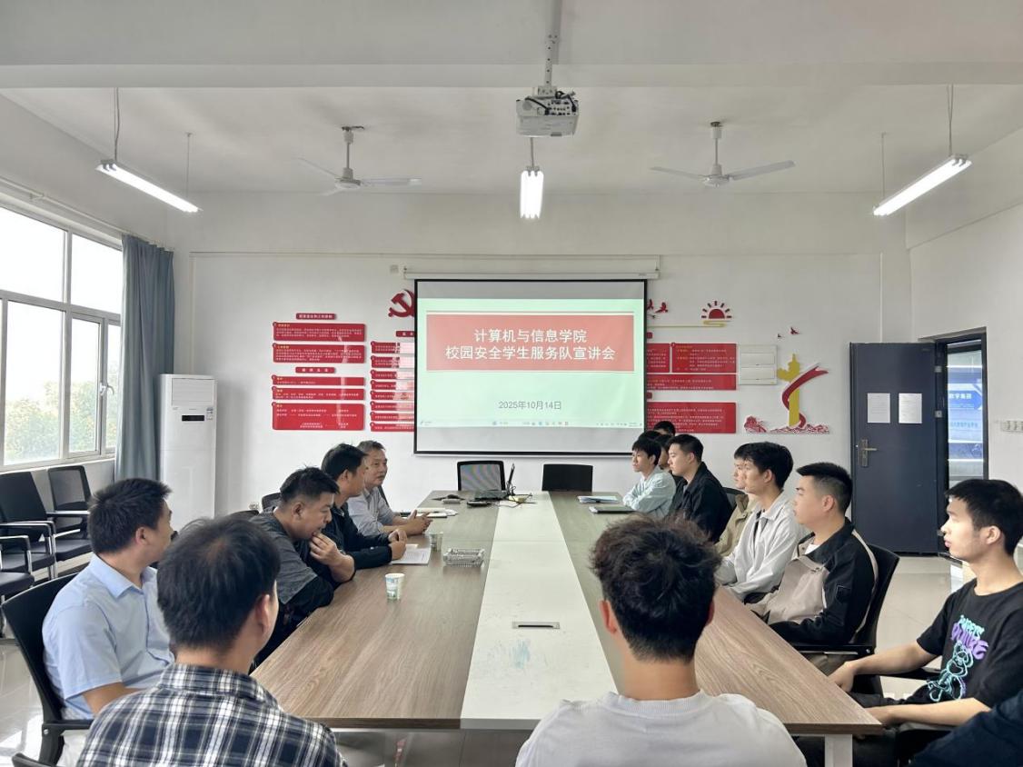 为切实守护师生生命财产安全,维护校园和谐稳定,同时充分发挥大学生在平安校园建设中的积极作用,江南online(中国)计算机与信息学院于2025年10月14日在4-311会议室召开校园安全学生服务队宣讲会。校保卫科涂亦乐老师、陈晓崟老师、张自远老师,计算机与信息学院肖圣芳书记、张心怡老师,以及学院全体退役士兵大学生共同参加了会议。