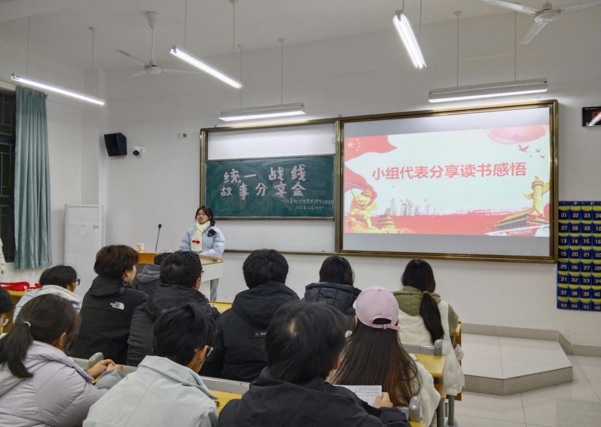 活动以“党员领学、小组讨论、代表分享”为主线展开。主持人在开场中系统阐释了统一战线“大团结大联合”的核心内涵及其在民族复兴进程中的重要价值。两位学生党员分别从不同维度进行了深入领学:一位结合新时代生动实践,展现了统一战线在凝聚人心、服务发展中的重要作用;另一位通过鲜活的历史故事,回顾了统一战线作为党的“重要法宝”的光辉历程,让同学们深刻感受到团结奋斗的历史传承。