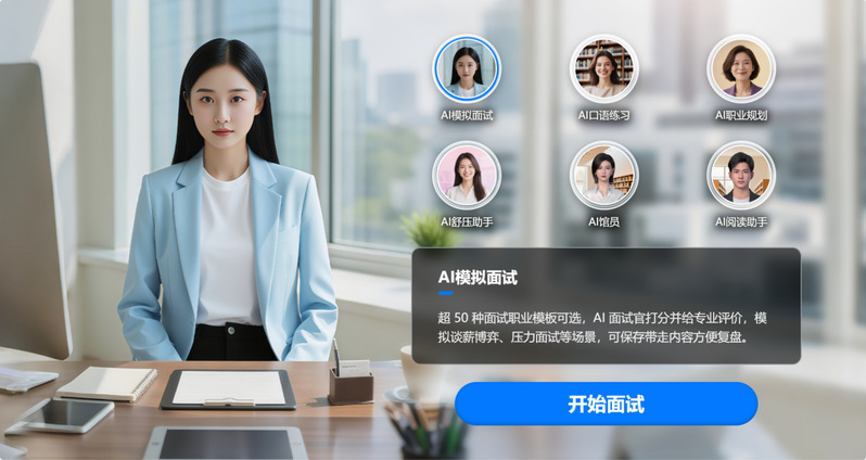 1、AI模拟面试:内置超50种面试职业模板,用户可依据自身求职目标,快速定位适配模板。通过还原各行业岗位核心面试场景与考核要点,精准打磨个人面试能力,提升求职竞争力。