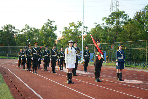 伴随着激昂的乐曲,国旗护卫队迈着铿锵有力的步伐,将五星红旗护送至旗杆下;在庄严的国歌声中,五星红旗冉冉升起,全体师生行注目礼,心中涌动着对先烈的缅怀、对历史的铭记以及奋勇前行的赤诚。