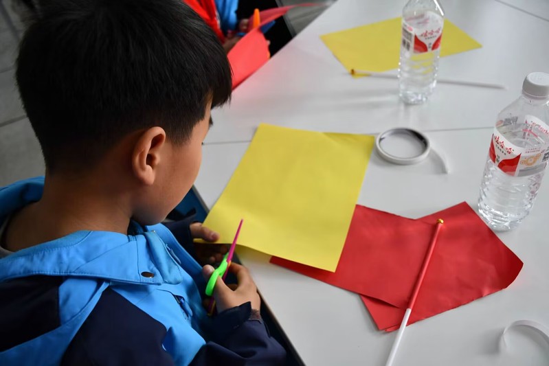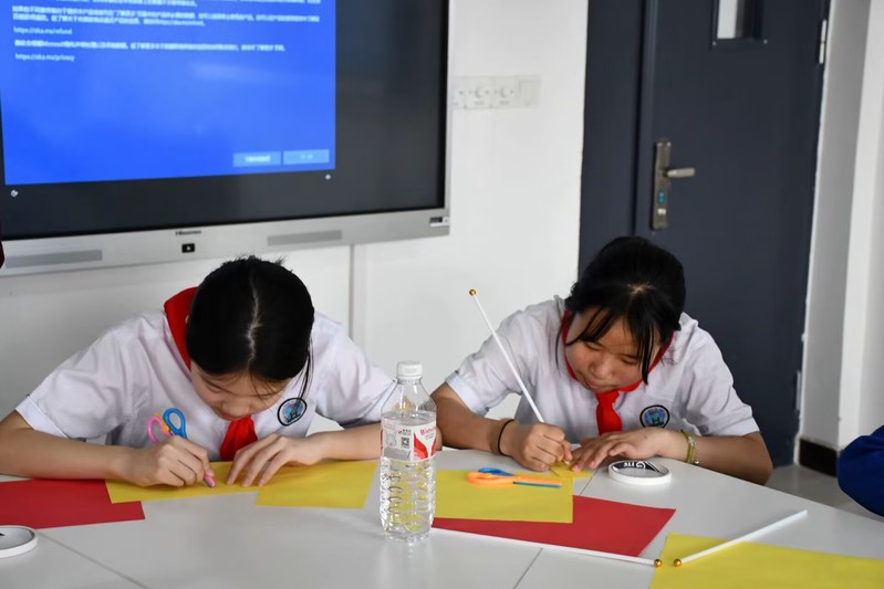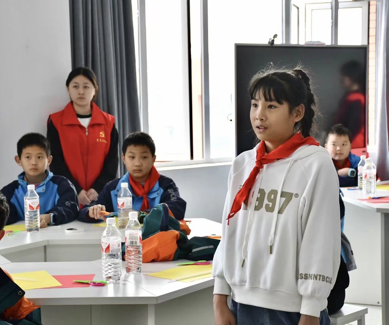 在实验楼内,一场寓教于乐的实验小活动正在进行。欧阳智欣同志通过讲述“红旗里的故事”,引导学生们积极参与到红旗的剪裁制作活动中学生党员欧阳智欣同志以清晰的思路、真诚的话语,带领学生们重温革命历史,讲述“红旗里的故事”,共同回顾中国共产党的光辉历程。整场党课内容丰富,阐述透彻,引导少先队员们铭记新中国来之不易,感受生在国旗下、长在党的怀抱中的幸福;在故事的推进中引出红旗的剪裁制作活动,少先队员们在剪裁五星红旗的过程中感悟红旗寓意,体会到其中浓浓爱国情谊。