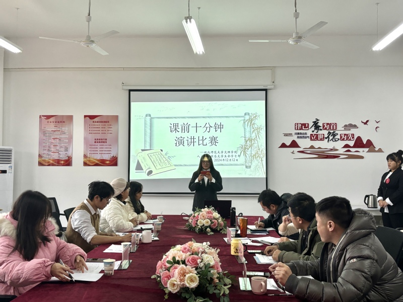 2024年12月12日下午,在学部党总支书记周景斌的精心组织下,人文学部在3号实验楼508会议室举行了课前十分钟演讲比赛,来自人文学部各专业班级的11名选手参赛,全体辅导员担任本次比赛评委。