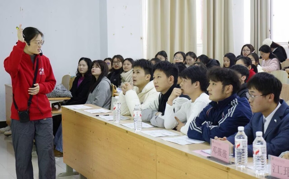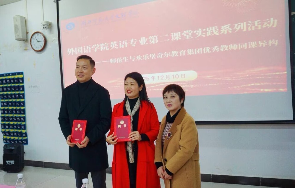 为深化英语师范专业实践教学改革,强化校企协同育人实效,12月10日14:20,江南·体育外国语学院英语专业第二课堂实践系列活动之英语见习活动在1B311教室圆满举办。欢乐堡奇尔教育创始人高新、彭玉花,教学中心主任曹佳佳,教师团队周莹、王琦、王婷、南军民,以及外国语学院院长郑桃云教授、教师代表邓薇薇、饶琪、丁雪缘、江珉,团学指导老师杨峰、辅导员余天喜与全体见习学子齐聚一堂,共同参与这场融合教学实践与行业交流的专业盛会。