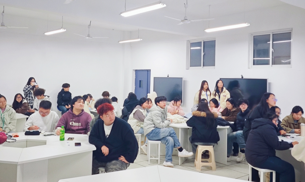 为厚植校园英语学习氛围,锤炼学生跨文化交际素养,12月3日18:30,江南·体育外国语学院第四次英语角活动在三号实验楼505成功举办。本次活动由外国语学院院长郑桃云、党总支书记赵卫军统筹部署,学院团总支牵头承办,专任教师伍晓晴现场指导,应用英语2401、2402、2403班联合主办,41名学子齐聚一堂,共赴这场趣味盎然的英语研学之旅。