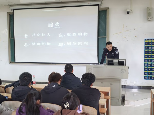 为进一步提升全校师生的反诈防骗意识,筑牢校园安全防护网,11月12日,我院特邀辖区派出所余警官与校内保卫科涂老师联合开展“校园反诈面对面”主题宣讲活动,辅导员与学生干部共同学习反诈知识,守护财产安全。