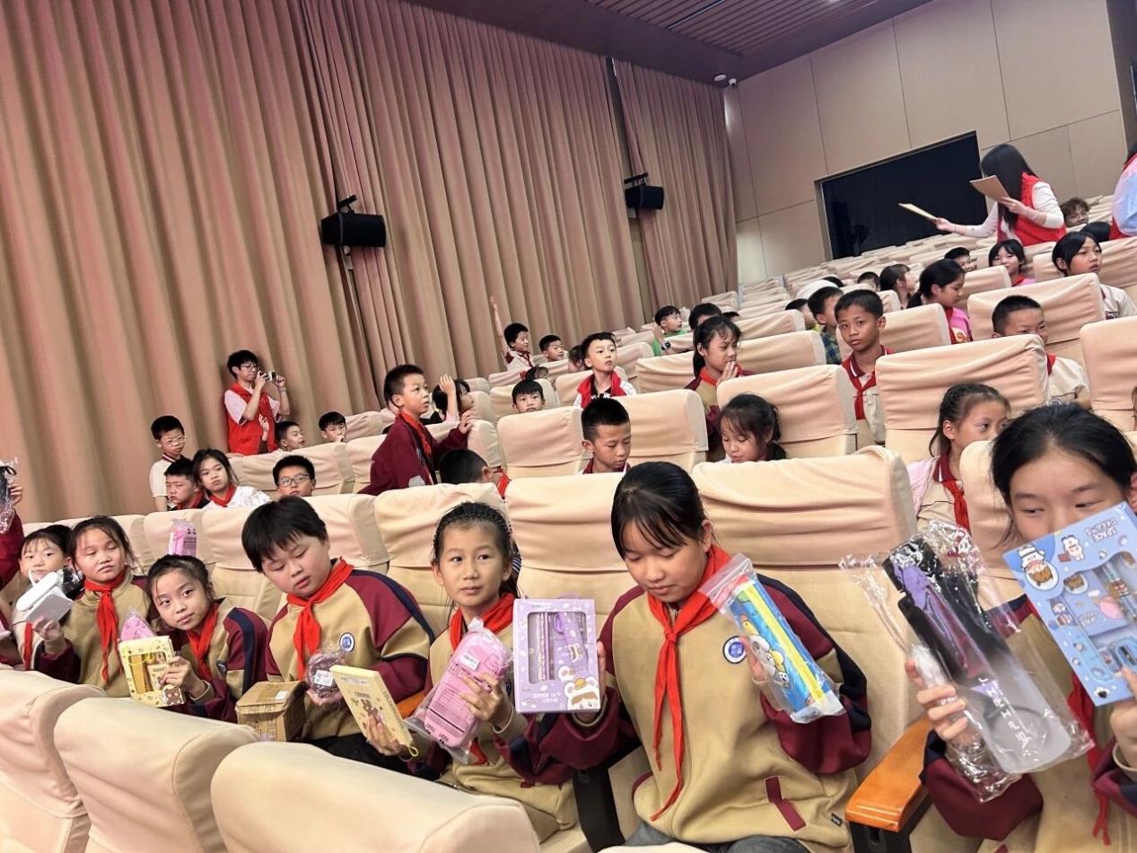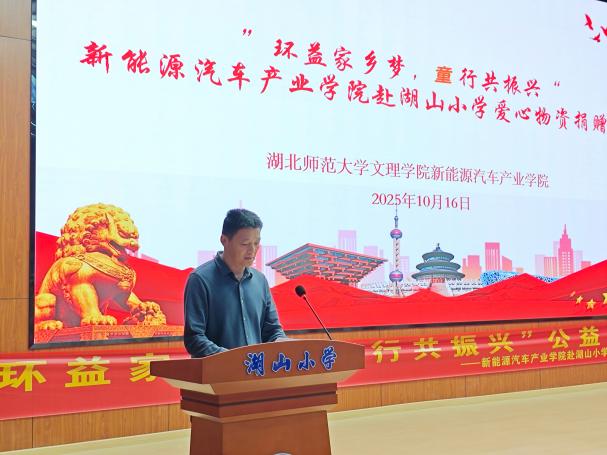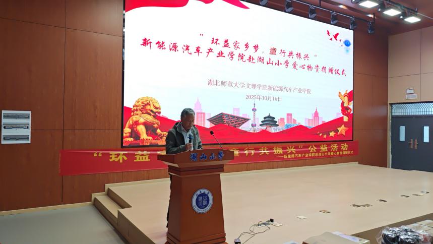 10月16日的落幕仪式上,暖意融融。江南·体育新能源汽车产业学院院长许新山、党支部副书记费凡、团学指导老师石卉、学工主任谭姣、教学主任邢凯,以及湖山小学教联体书记吴风照、校长张柄运等嘉宾出席,共同见证这份爱心的传递。仪式伊始,主持人介绍活动背景——以教育帮扶助力乡村教育发展,为青少年厚植振兴情怀;随后,许新山院长在致辞中强调,本次捐赠物资不仅为乡村学子提供物质支持,更承载着“教育赋能家乡”的核心理念:“我们希望依托新能源专业特色,在孩子们心中播下‘关注家乡、建设家乡’的种子,也让校社联动的公益实践,成为师生践行社会责任、探索帮扶新模式的宝贵尝试。”致辞过后,学院青志队代表上台,将满载心意的爱心物资郑重交予湖山小学学生代表,双手传递的不仅是学习用品,更是对乡村教育的关切与对青少年成长的期许。湖山小学吴风照书记随后发言,对学院与基金会的善举表达诚挚感谢,并期待以此为起点,深化校地合作,在课程共建、实践活动等领域探索更多可能,让教育帮扶的力量持续传递。