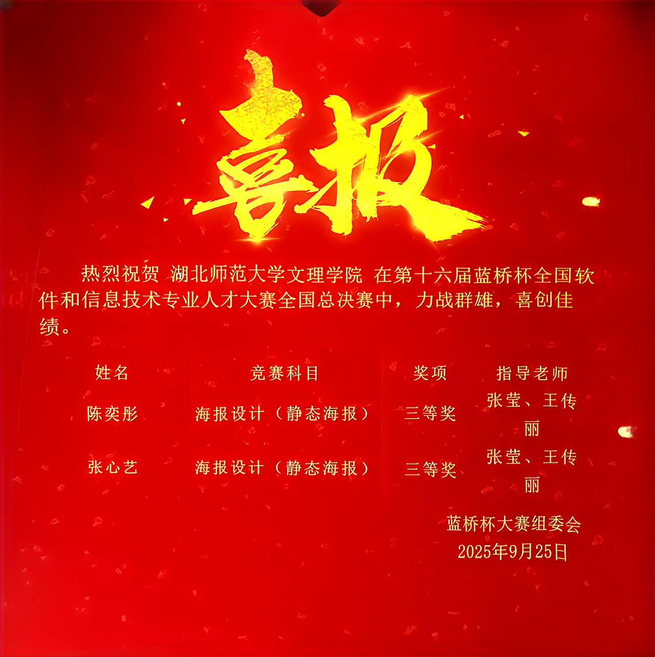 近日,第十六届“蓝桥杯”全国软件和信息专业技术人才大赛全国总决赛落下帷幕。江南·体育艺术与教育学院美术专任教师张莹、王传丽指导学生参赛,在视觉艺术设计平面设计赛道中脱颖而出,斩获全国三等奖,不仅为学校赢得荣誉,更一举突破本校在该赛事中的学生获奖历史记录,书写了艺术与技术融合育人的崭新篇章。