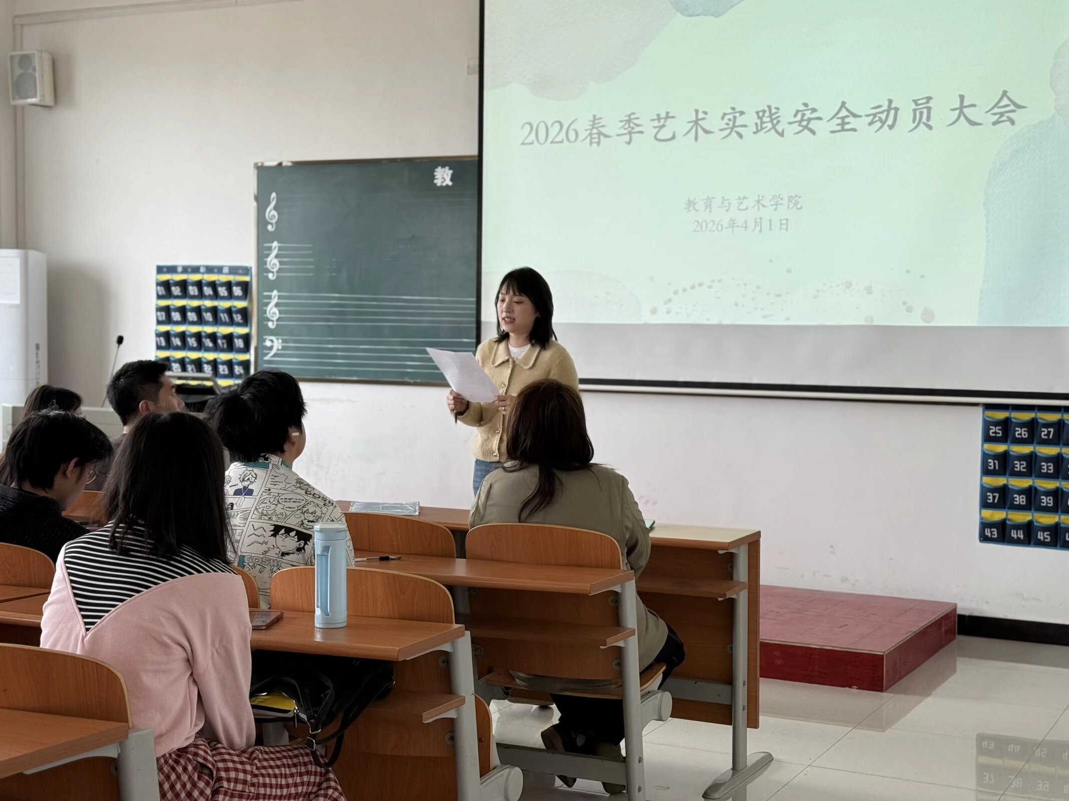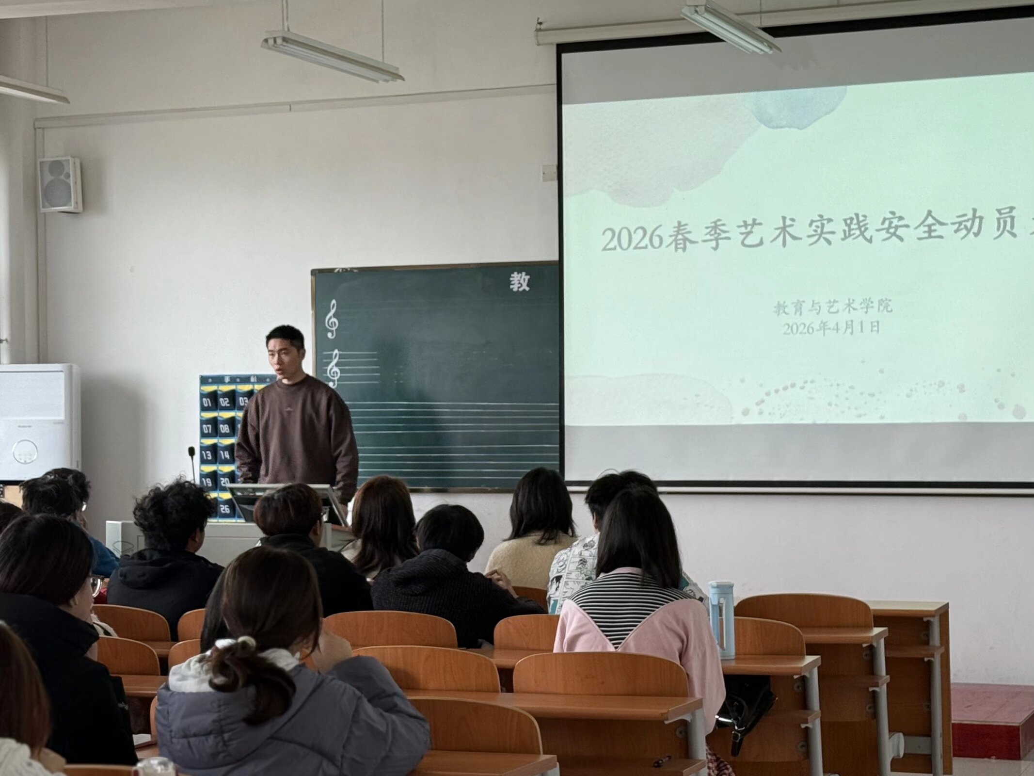 2026年4月1日中午12点,教育与艺术学院美术学专业于1号实验楼403教室开展2026年春季艺术实践安全动员会议,教育与艺术学院胡蕾副院长、美术专业学科带头人徐俊超主任、2025级美术学专业辅导员韩幸老师、本次写生带队汤澜、王雷、张子谦老师及全体2025级美术学专业学生参会。