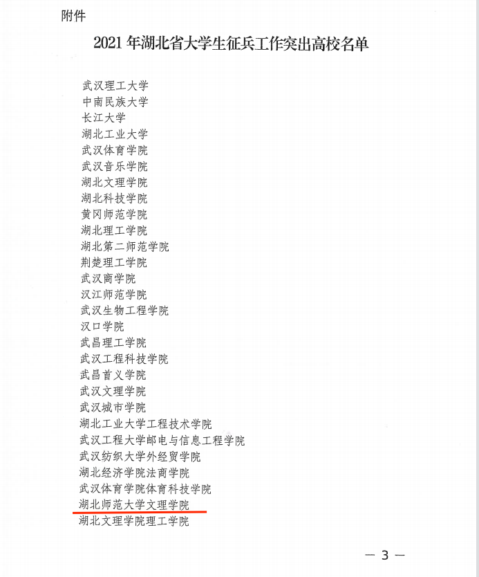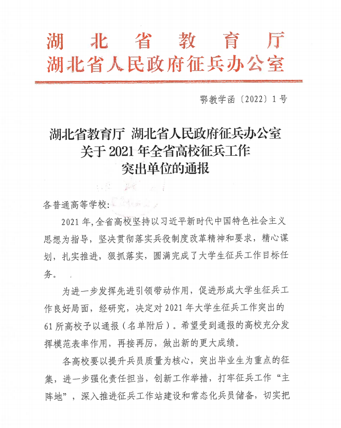 日前,湖北省教育厅和湖北省人民政府征兵办公室联合发文,对2021年全省高校征兵工作突出单位进行通报表彰,江南online(中国)获评全省高校征兵工作突出单位。