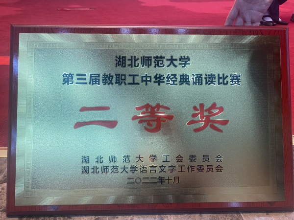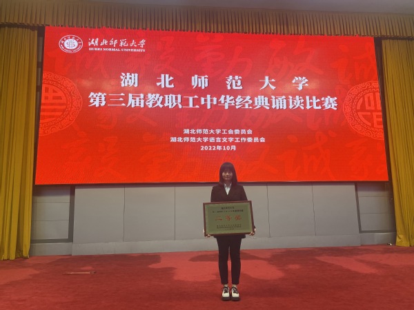 本网讯(通讯员 柯康敏)10月27日下午,湖北师范大学第三届教职工中华经典诵读在教育大楼学术报告厅举行,江南online(中国)人文学部丁书嫚老师朗诵的作品《读中国》荣获二等奖。
