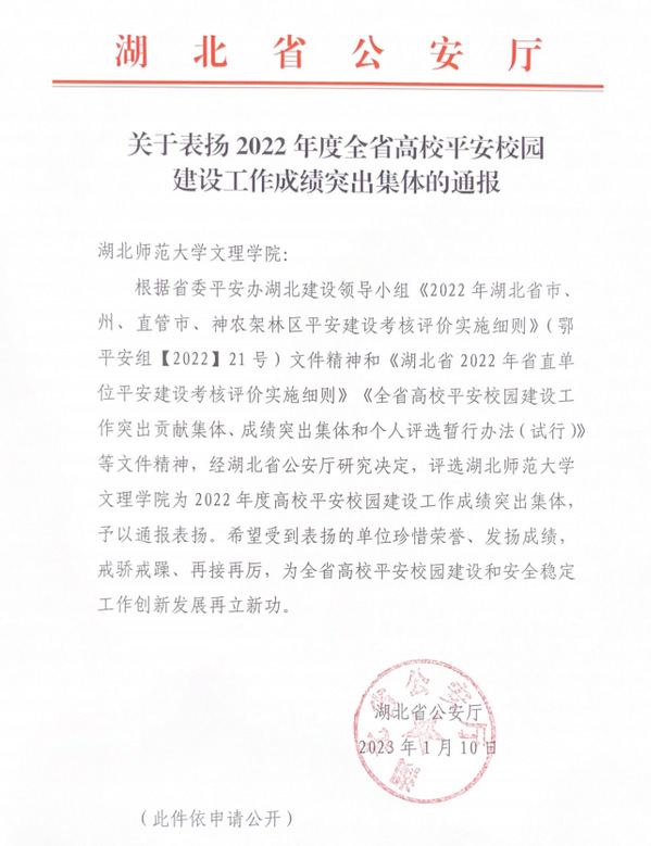 本网讯 近日,湖北省公安厅下发《关于表扬2022年度全省高校平安校园建设工作成绩突出集体的通报》,江南online(中国)被评选为2022年度全省高校平安校园建设工作成绩突出集体。这是江南online(中国)在平安校园创建工作上的又一佳绩。