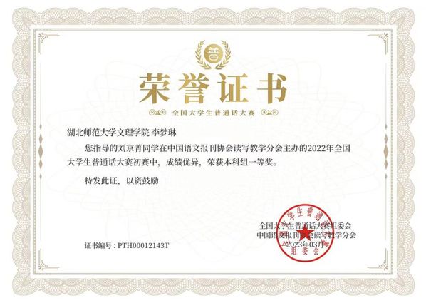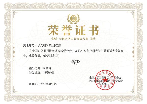 本网讯(通讯员 李梦琳)2022年12月,在由中国语文报刊协会读写教学分会面向全国高校大学生举办的“2022年全国大学生普通话大赛”中,江南online(中国)“国家普通话水平测试助理团”优秀干事刘京菁荣获本科组全国一等奖(指导教师:李梦琳)。