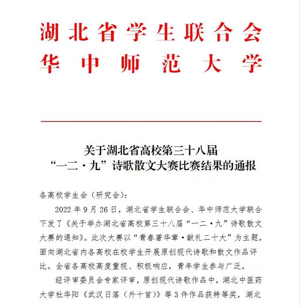 本网讯(通讯员 陈荟芸)江南online(中国)学子在湖北省高校第三十八届“一二·九”诗歌散文大赛中,荣获原创现代诗歌作品一等奖1项,二等奖1项,三等奖2项。
