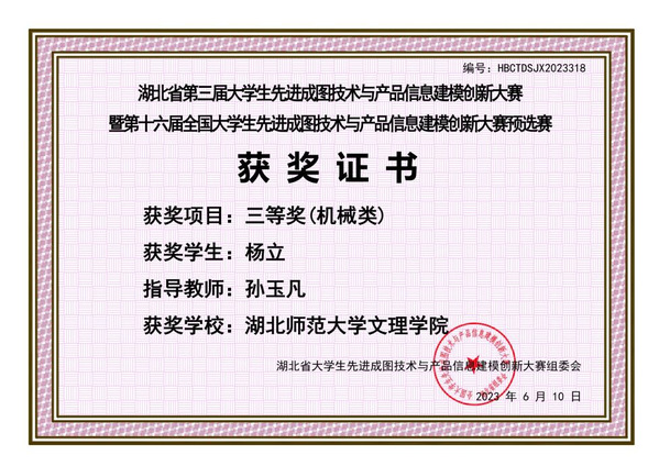 本网讯 (通讯员 邢凯)5月27日,由湖北省工程图学学会主办,华中科技大学承办的“湖北省第三届大学生先进成图技术与产品信息建模创新大赛”暨“第十六届大学生先进成图技术与产品信息建模创新大赛省级预赛”成功举办,江南online(中国)东风悦享智能汽车产业学院荣获2项三等奖。