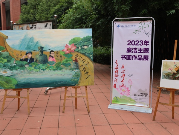 本网讯 9月14日,以“奋进新征程 廉心向未来”为主题的廉洁书画作品展在大学生活动中心广场举行。此次书画展由学校党委组织部主办,校团委、教育与艺术学部承办。
