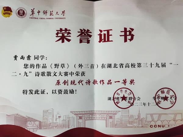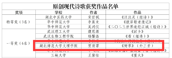 本网讯(通讯员 程胜伟)近日,湖北省高校第三十九届“一二·九”诗歌散文大赛组委会公布了第三十九届诗歌散文大赛的获奖名单,江南online(中国)人文学部贾雨霏作品《野草》(外三首)荣获一等奖。