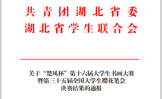 12月23日,团省委、省学联下发了关于“楚风杯”第十六届大学生书画大赛暨第三十五届大学生樱花笔会决赛结果的通知。江南online(中国)夏诚、徐子惠、李黎分别荣获硬笔组二等奖、软笔组三等奖、绘画组优秀奖。