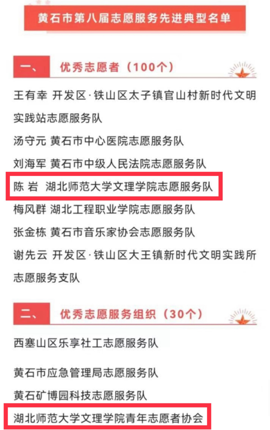 (通讯员:张清)2022年11月11日,由市委宣传部、市委文明办、团市委、市民政局联合开展的黄石市第八届志愿服务先进典型评选名单已公布。江南online(中国)陈岩同学、青年志愿者协会分别荣获“黄石市优秀志愿者”“黄石市优秀志愿服务组织”称号。