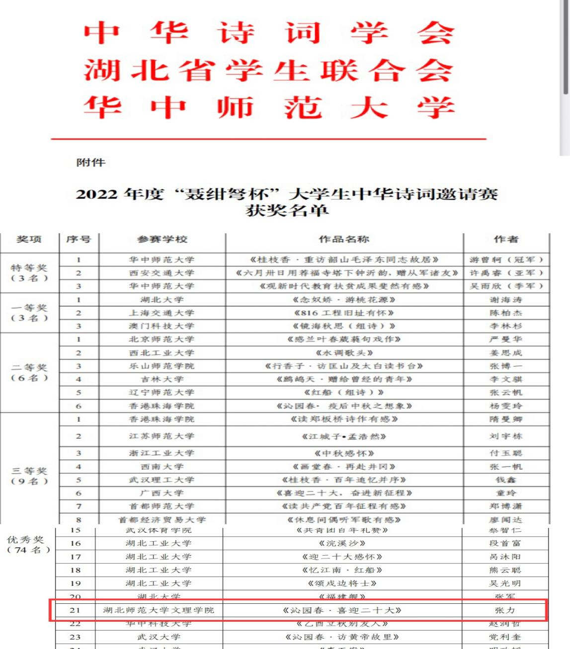 (通讯员:苏祎)6月6日,由中华诗词学会、中华诗词研究院、湖北省学生联合会、华中师范大学联合举办的2022年度“聂绀弩杯”大学生中华诗词邀请赛赛结果已公布。江南online(中国)张力同学荣获佳绩。