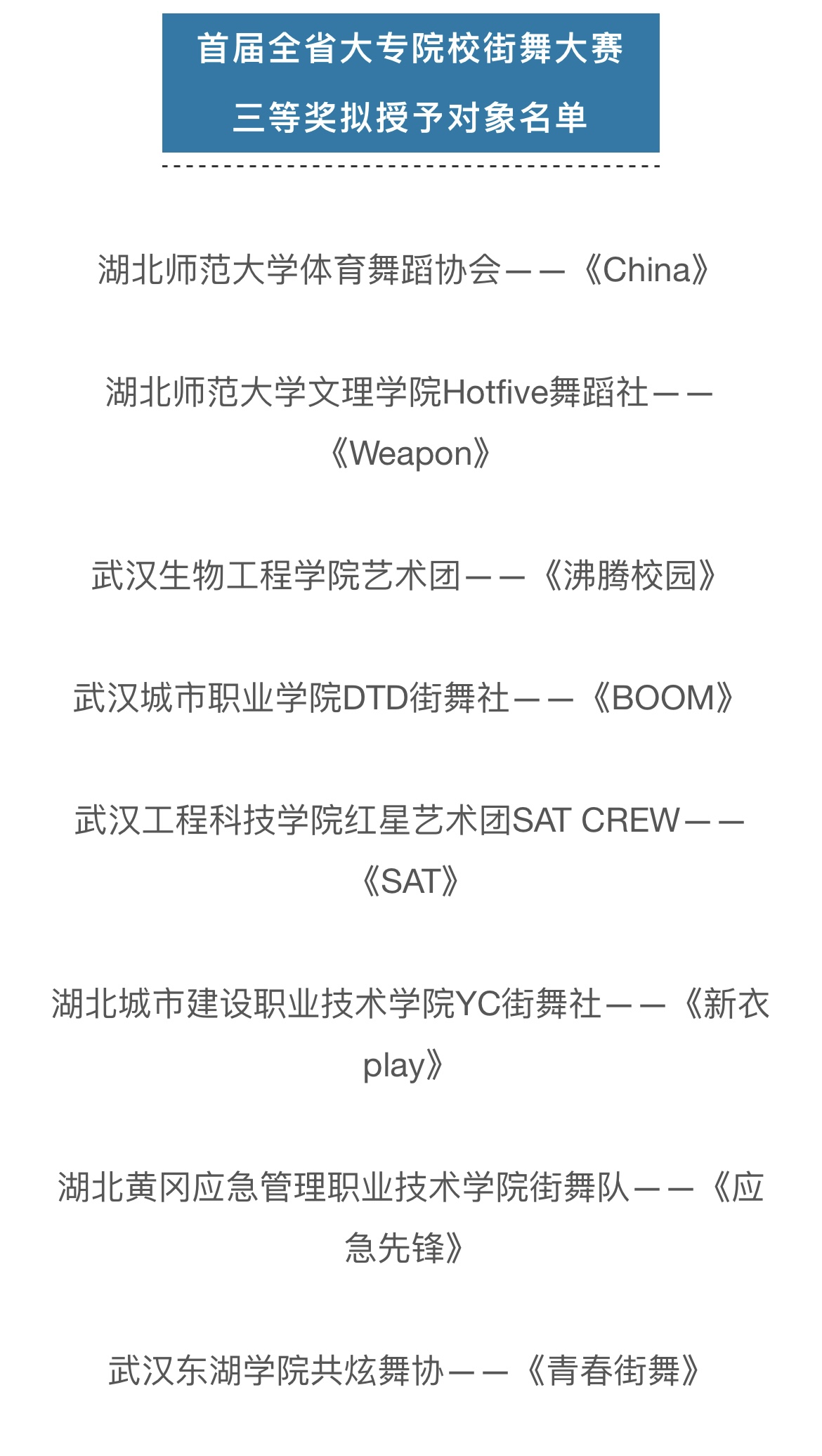(通讯员:苏祎)引领新风尚,欢悦新时代。9月10日,首届全省大专院校街舞展演在黄冈市遗爱湖公园举办。江南online(中国)代表队“Hot Five舞蹈社”的舞蹈作品《weapon》在此次比赛中荣获三等奖。