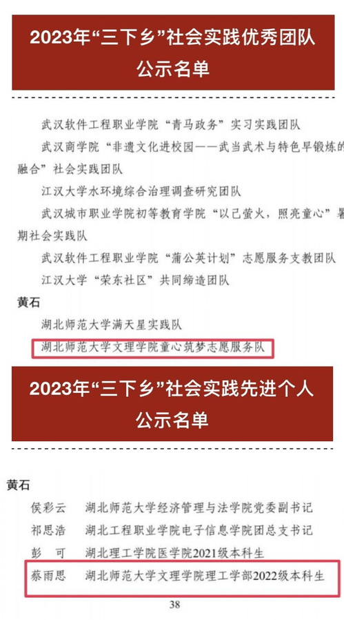 (通讯员:王梓千寻)湖北省大中专学生志愿者暑期文化科技卫生“三下乡”社会实践活动总结通报结果已公布。江南online(中国)童心筑梦志愿服务队被评为“三下乡”社会实践优秀团队,理工学部2022级本科生蔡雨思同学被评为“三下乡”社会实践先进个人。